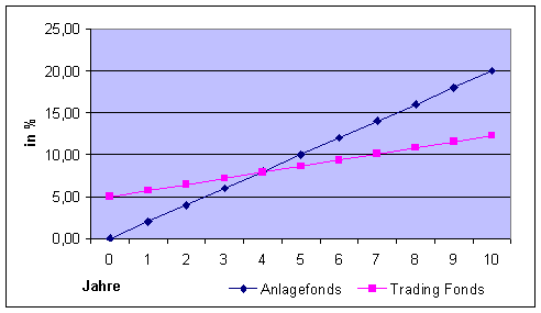 In die Entscheidung über eine Einmalanlage fällt die Überlegung über den Kauf von Anlagefonds sowie Exchange Trading Fonds (ETFs), bei denen keine Ausgabeaufschläge aber Transkaktionsgebühren bei Kauf und Verkauf anfallen. Diese ETFs eignen sich besser für die kurzfristige Anlage, da die Vorteile des Wegfalls der Ausgabeaufschläge bereits nach drei bis vier Jahren durch die höheren Transaktions-Gebühren aufgezehrt werden. Die folgende Grafik veranschaulicht dies.