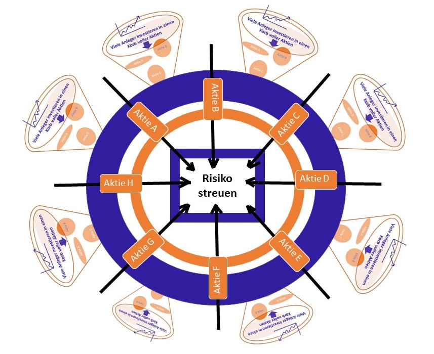 Da der ETF einen Index nachbildet (z.B den DAX - Deutscher Aktienindex) werden die Vermögenswerte auf die unterschiedlichen Unternehmen die im DAX gelistet sind, aufgeteilt. Somit wird das Risiko gestreut.